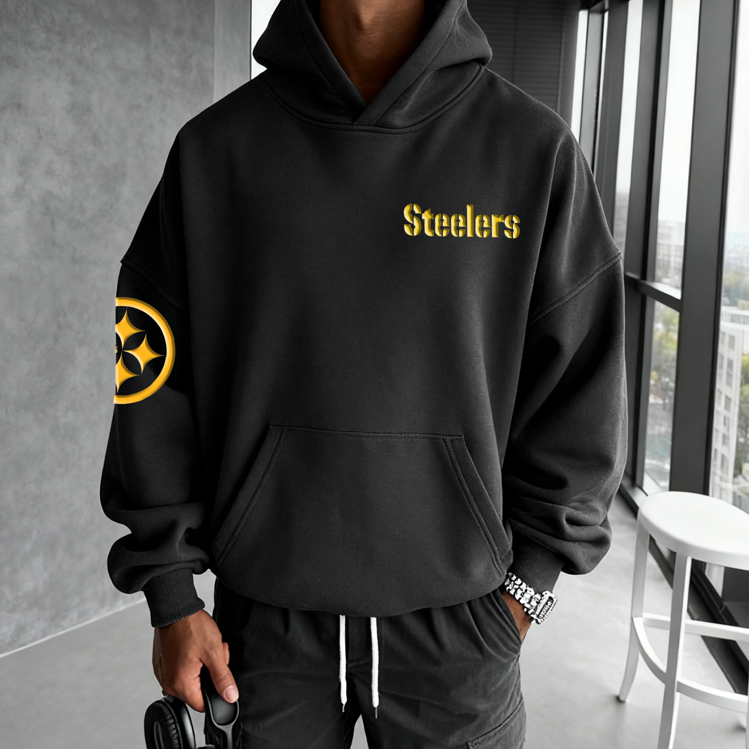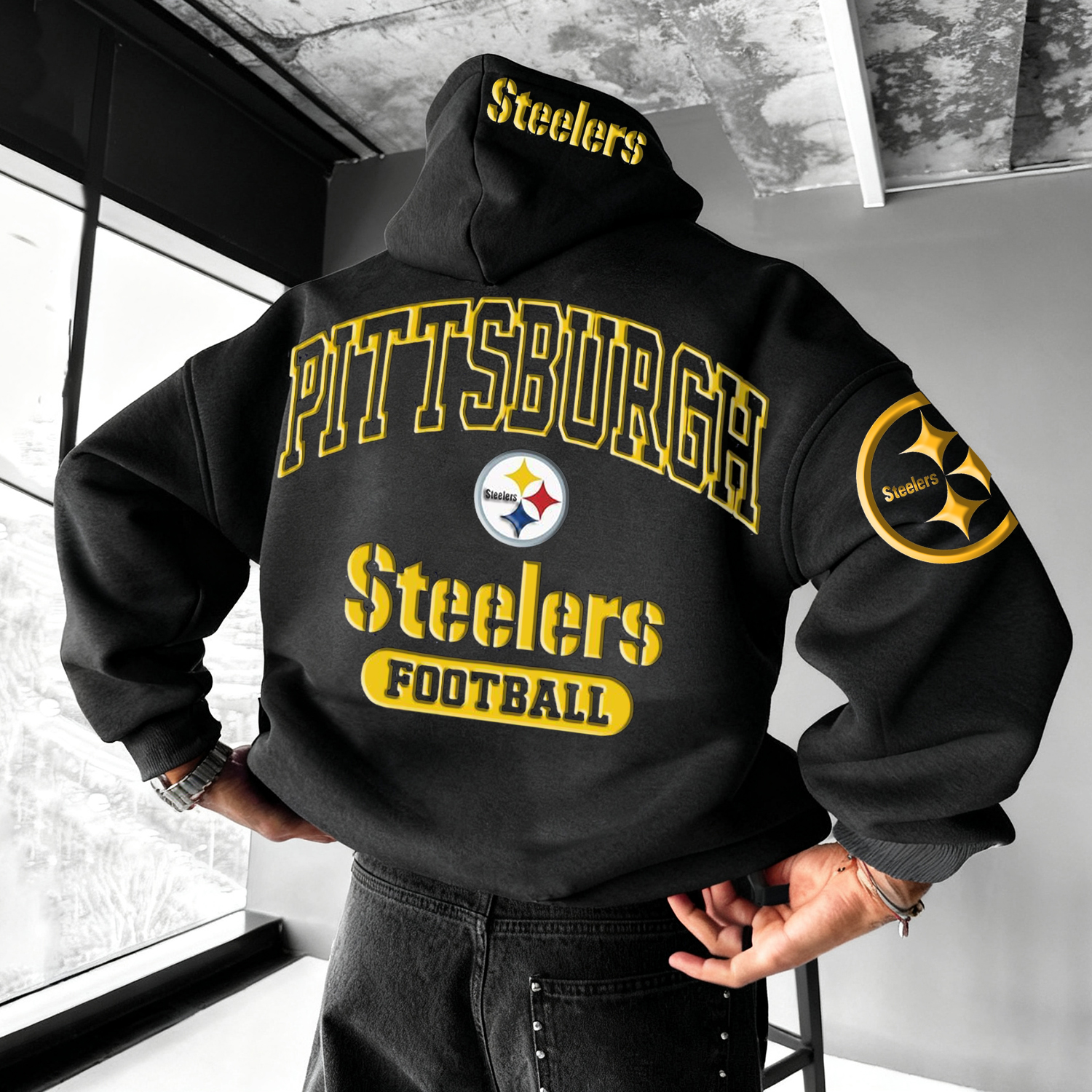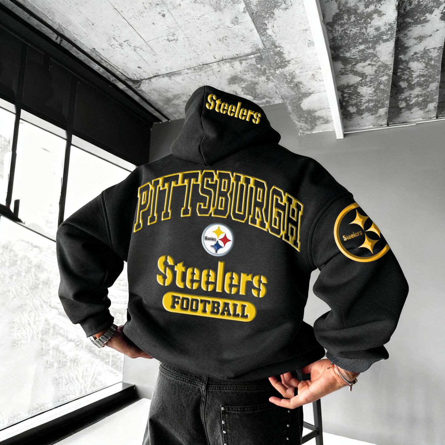 • Design Elements: Large back logo print, sleeve text design, hood with embroidered emblem